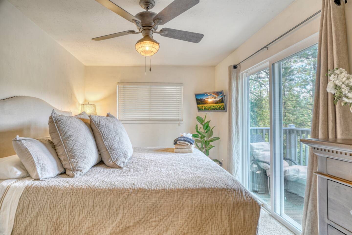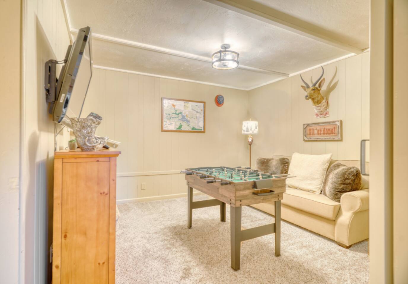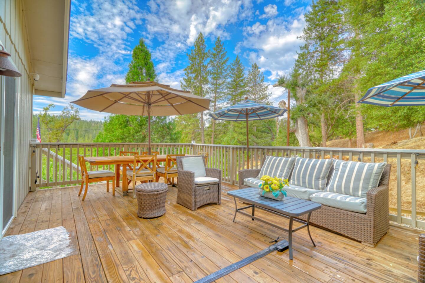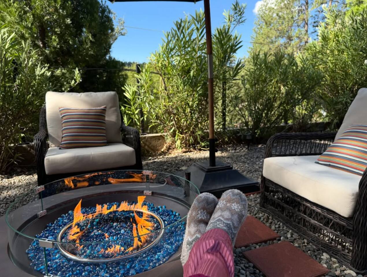 ❄️ Winter rates are already adjusted seasonally. The nightly price shown reflects the current winter rate — no promo code or special request needed. StayCation Sierra – Nonpareil Retreat is a peaceful 3BR + bonus sleeping room mountain cabin with 2 full bathrooms, a dedicated game room, and spacious outdoor decks overlooking the forest. Set apart from neighbors on a quiet, wooded lot, it offers true Sierra privacy while still being just minutes from Pine Mountain Lake’s beaches, marina, golf course, and hiking trails. Guests love the private hot tub, propane fire pit, BBQ grill, outdoor movie projector, foosball table, and retro games in the game room. High-speed WiFi makes it easy to stay connected or work remotely. The cabin is ideal for families, couples, and small groups seeking a calm Yosemite-area escape surrounded by nature.