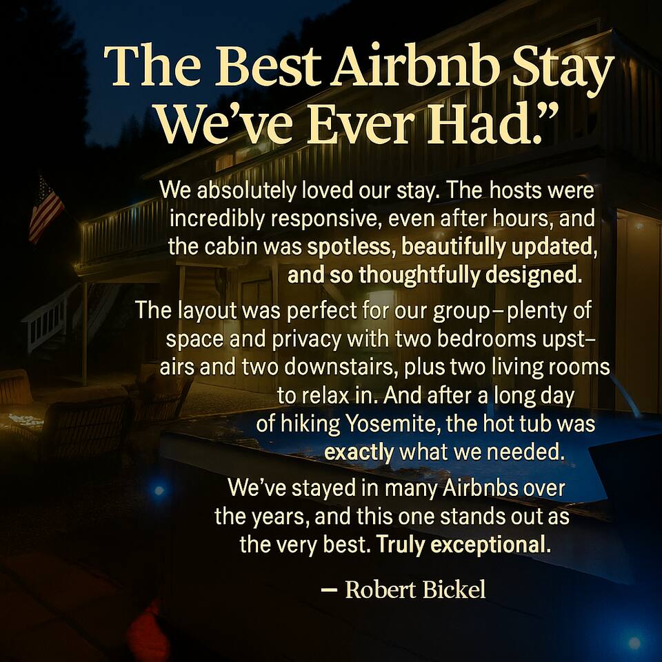 Forest Views • Private Hot Tub • High-Speed WiFi • Outdoor Movie Nights • Minutes to Yosemite