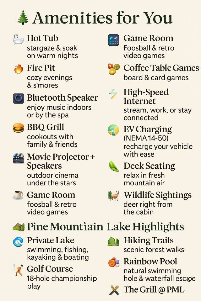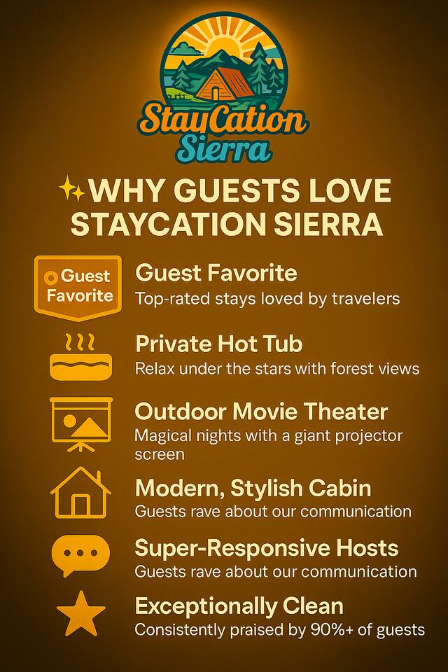 A rental agreement and refundable security deposit authorization are required after booking. Accessibility includes step-free entry to the downstairs level and a hot tub handrail. Up to 2 pets allowed ($75). PML requires a $50 per vehicle gate fee, paid at entry. Quiet hours: 11 PM–7 AM. Please follow house rules and safety guidelines to help us maintain a peaceful, high-quality experience. 🌲 Why Guests Love StayCation Sierra – Nonpareil Retreat Perfect for families, couples, and small groups seeking a peaceful Yosemite-area escape. ⭐ Top Cabin Amenities 🛁 Private hot tub for starry nights 🔥 Cozy propane fire pit 🎬 Outdoor movie projector 🎮 Foosball and retro games 🌐 High-speed Wi-Fi (streaming + remote work) ⚡ EV charging outlet (RV-style plug for Teslas & EVs) 🍔 Propane BBQ grill 🛋 Spacious deck with forest views 🦌 Frequent deer and wildlife sightings ❄️ Central heating and A/C ☕ Coffee and tea station 🏞 Pine Mountain Lake Amenities Just minutes from the cabin: 🌊 Private lake for swimming, paddling, and fishing 🏖 Beaches with mountain views 🏌️ Championship golf course 🏓 Pickleball and tennis courts 🐴 Equestrian center with trail rides 🏊 Seasonal outdoor swimming pool 🥾 Scenic hiking trails 🌈 Rainbow Pool waterfall and swim area nearby 🎯 Outdoor archery and shooting ranges 🍴 The Grill @ PML for dining 🚗 Location Highlights 🚪 Located inside Pine Mountain Lake’s gated community 🏞 Short drive to Yosemite’s entrance 🛒 Close to Groveland’s shops and restaurants 🧭 Quiet, peaceful, and surrounded by nature